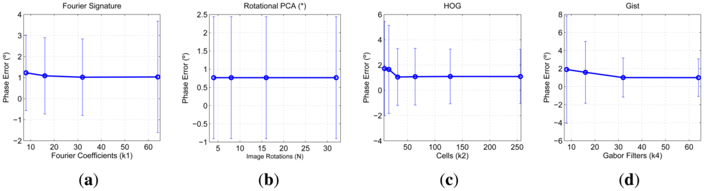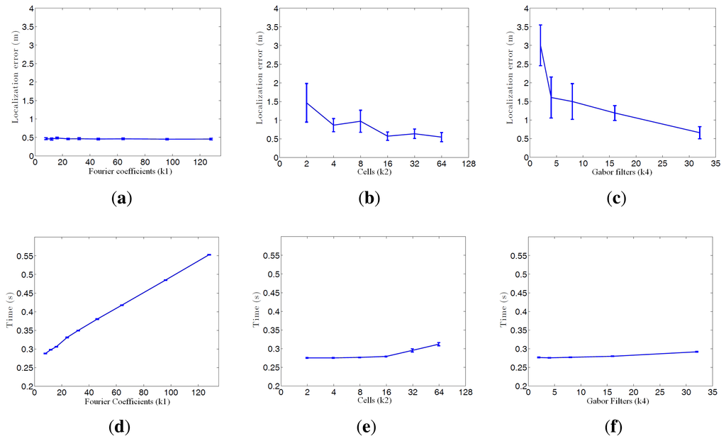 Figure 16 shows the average error during the localization process and the step time. Every time a route image arrives and the position of the robot is estimated using the Monte Carlo algorithm is considered a step. If we compute the localization error at each step (comparing the result of the algorithm with the actual position of the robot) we get the curves at Figure 16a–c. These curves show how the behavior of the Fourier Signature is the most stable independently on the value of k1. HOG presents similar results when the number of cells k2 is between 16 and 64, and gist presents also better results when the number of Gabor masks k4 is high, but the error in all cases is higher comparing to Fourier Signature.