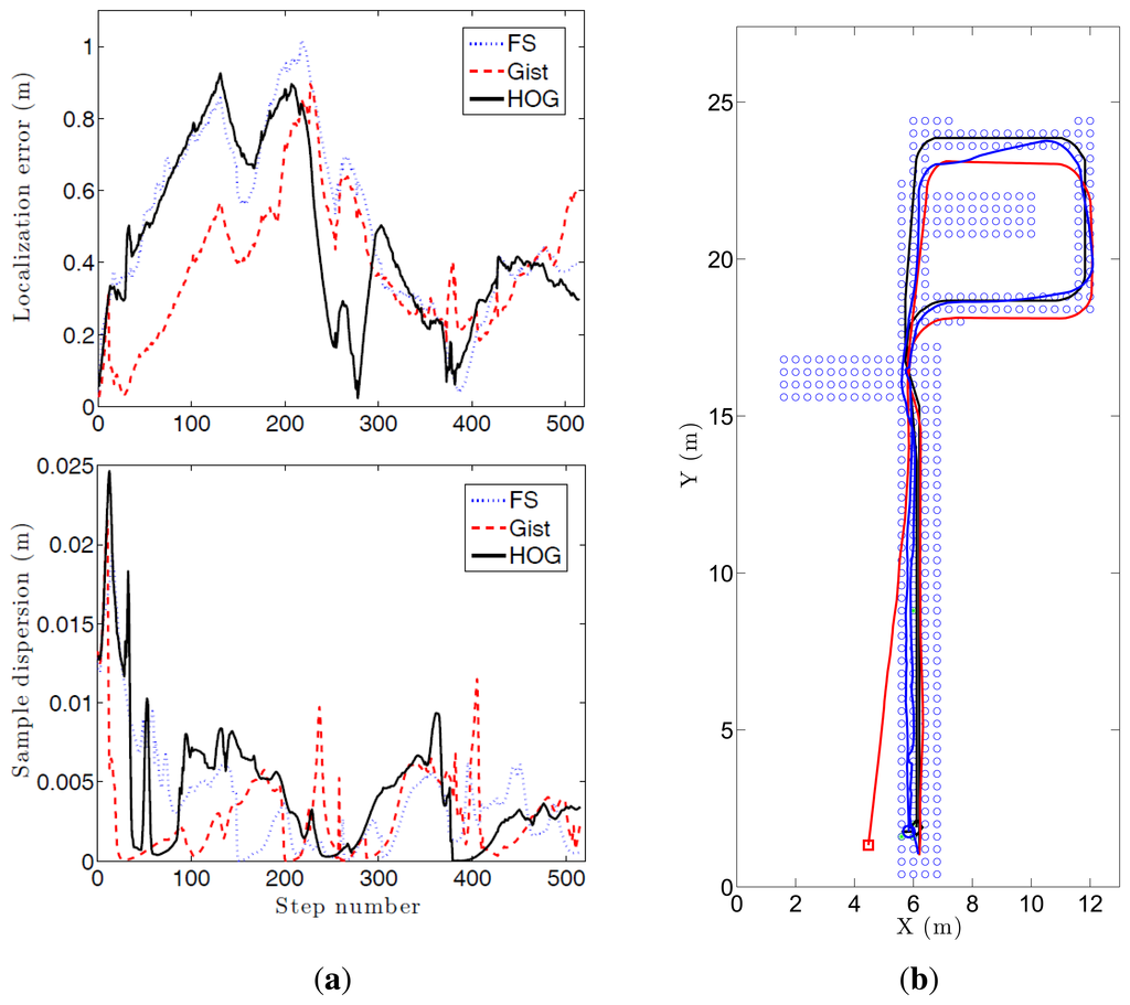 Figure 15 shows the evolution of three experiments carried out with FS and k1 = 32, HOG and k2 = 16, and gist and k4 = 16. (a) shows the localization error and the dispersion of the particles. A sudden increase in this dispersion indicates visual aliasing (the nearest images in the database are in far points). In general, the dispersion is high at the beginning and decreases as new information arrives. The algorithm is able to recover from visual aliasing with the three descriptors. Figure 15b shows a bird's eye view of the process when using the HOG descriptor and k2 = 16. The blue dots are the positions of the map images, the black curve is the ground truth of the route followed by the robot, the red curve is the trajectory estimated using only the odometry data and the blue curve is the trajectory estimated making use of the probabilistic process. The robot starts at the bottom of the map (coordinates x = 6, y = 2 m), advances to the upper side of the figure, closes the loop and goes back to the initial position.