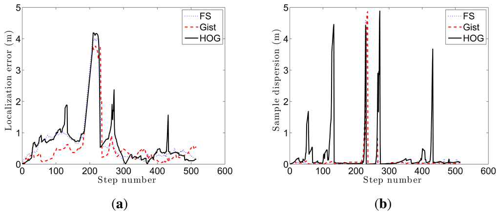Figure 18 shows the evolution of (a) the localization error and (b) the dispersion of the samples during these three experiments. (a) shows a sudden increase in error around step 200, when the robot is kidnapped. It recovers relatively quickly from this error and HOG produces another error around step 280, but it also recovers soon; (b) shows some cases of visual aliasing that produce sudden increases on the dispersion of the particles.