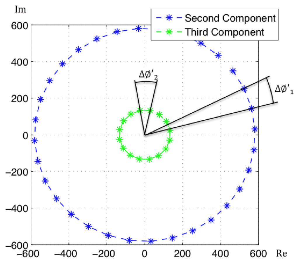 Since the projection basis is complex, so will be the coefficients in the projections of the images. It can be proved that the coefficients of an image and its rotated versions have the same modulus, with only a change in argument [18]. Moreover, the phase lag between the coefficients of two consecutive rotated versions of an image is constant as Figure 2 shows. This phase lag can be calculated as: