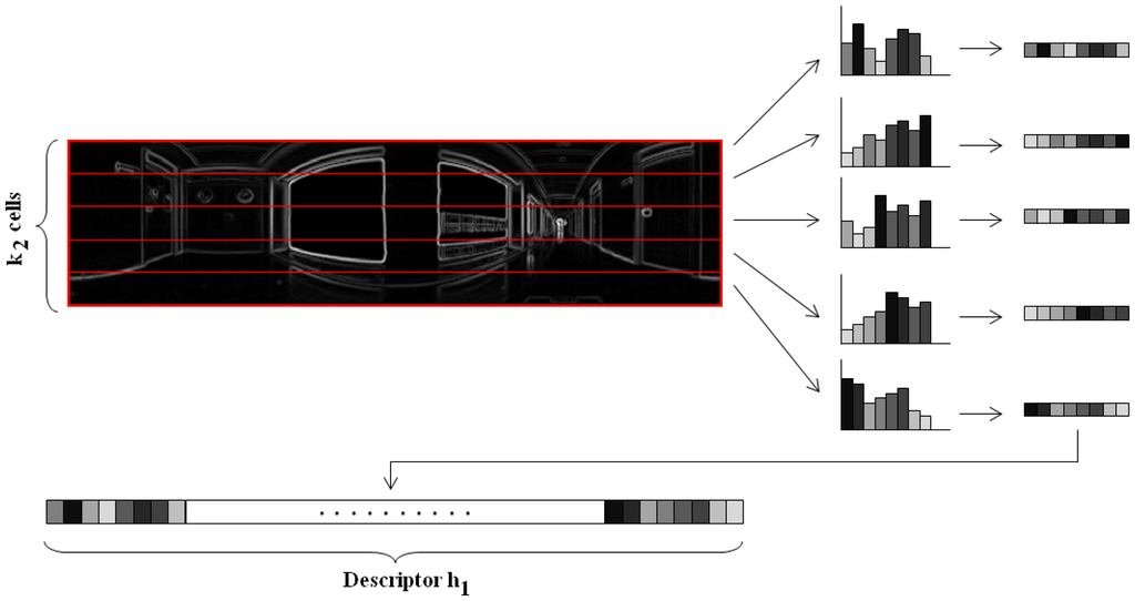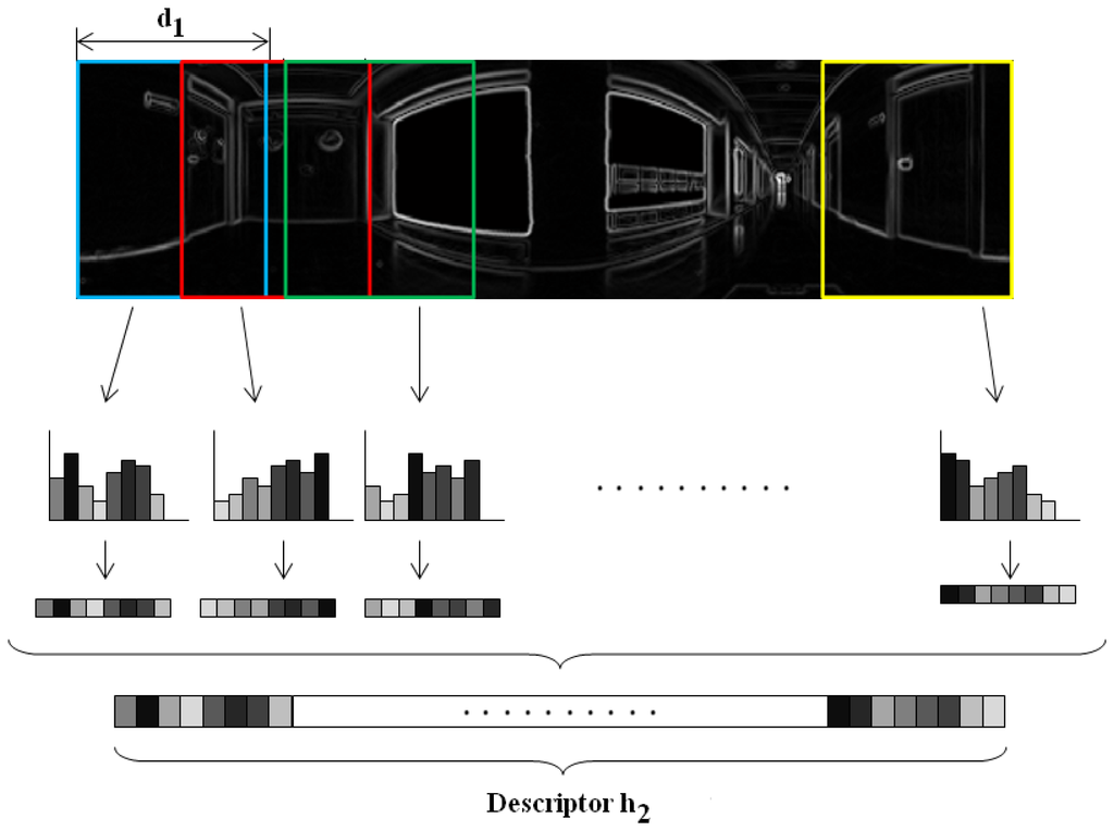 Orientation binning. The image is divided in cells and the histogram from each cell is computed. We have decided to work with 8 histogram bins uniformly distributed between 0 and 180 degrees. Each pixel in the cell contributes to the histogram bin that contains the orientation of that pixel θ, with a weighting factor equal to the gradient magnitude of the pixel |G|. In this point, we introduce a change respect to the classical HOG descriptor. We have decided to build these histograms twice, first dividing the panoramic scene into horizontal cells, to get a rotationally invariant descriptor h⃗1, as Figure 3 shows and then, dividing the scene into vertical cells with overlapping, to build a second descriptor h⃗2 that allows us to estimate the robot orientation with precision, as shown on Figure 4. This is one of the contributions of the paper.