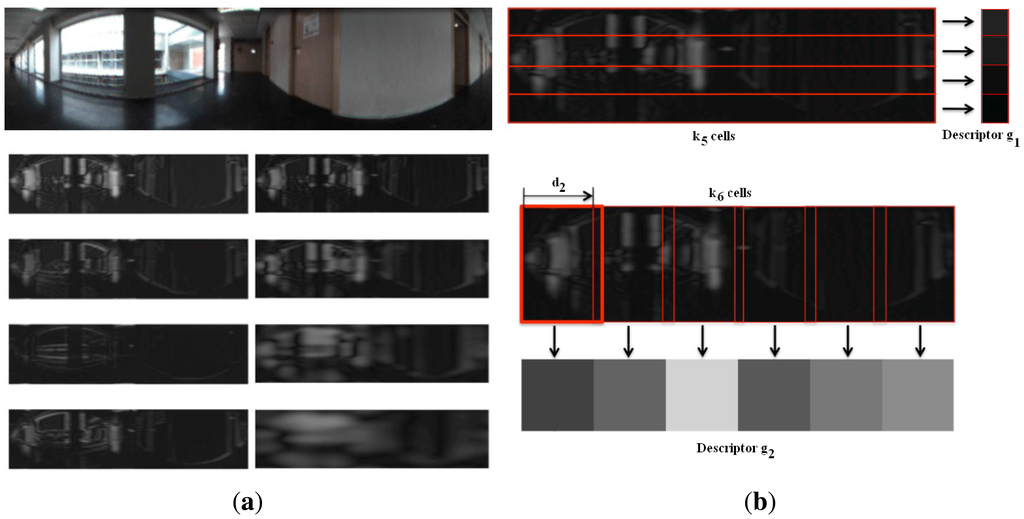 We can find in the literature few applications of this descriptor in mobile robotics. For example, Chang et al. [26] present a localization and navigation system based on these gist models and Murillo et al. [27] make use of gist descriptors to solve the localization problem in urban areas. However these two works compute gist only in certain areas of the image. As our objective is to test the performance of global appearance descriptors, inspired in [25] we have designed a unique descriptor per scene that, when computed from a panoramic image, presents rotational invariance.