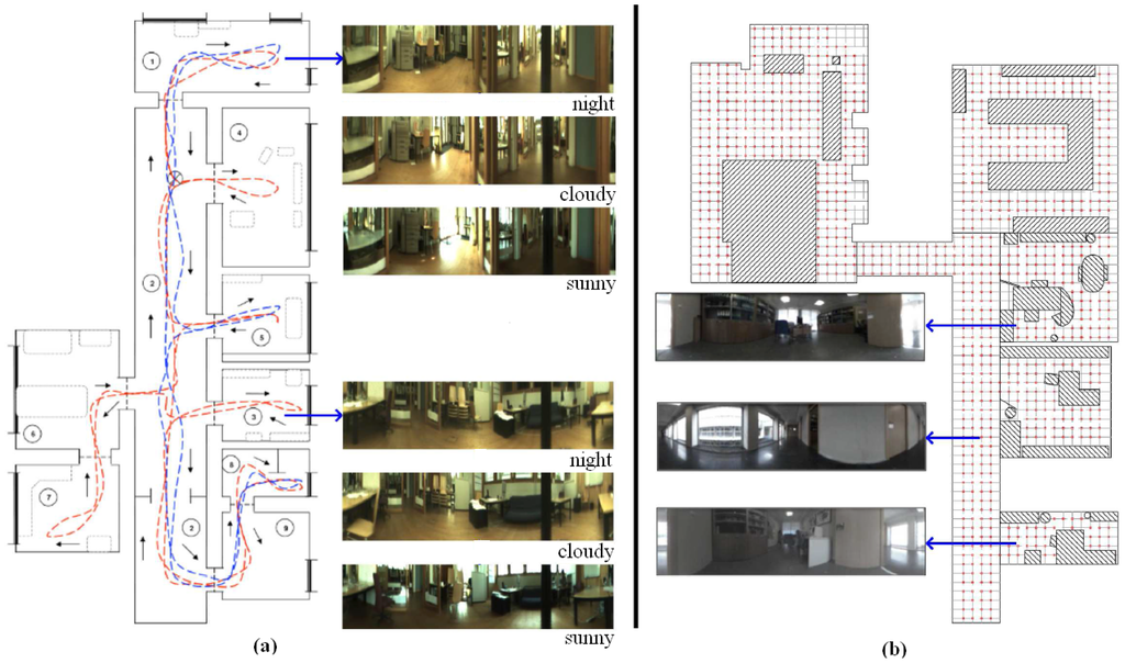 We make use of two databases, captured with two different catadioptric systems (with different geometry). This fact does not affect the process to compute the descriptors since we approach the problem from a topological point of view. Therefore, a camera calibration process is not necessary. First, the Quorum database has been captured by ourselves in an indoors environment (Quorum 5 building, at Miguel Hernandez University, Spain). This database includes a corridor and some offices and meeting rooms. This database is composed of two sets of images. The first one (training set) is composed of 873 panoramic 128 × 512 images which have been captured on a dense 40 × 40 cm grid of points. The second one (test set) is composed of 546 images captured in all the rooms, in some half-way points among the grid points and with different orientations and times of day. Figure 6 shows a bird eye's view of the grid points where the robot captured the training set and some samples of panoramic scenes.