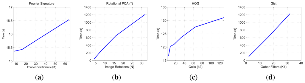 Comparatively, PCA is the computationally heaviest method, despite of using the properties of the circulant matrices to carry out the SVD decomposition. Fourier Signature is the fastest algorithm and gist is the most compact descriptor, thanks to the blockification method used to compress the information.