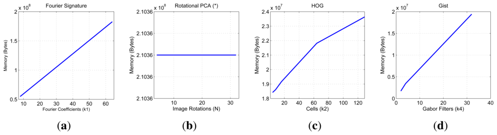 As for HOG, the parameter we have varied to shown these graphics is the number of horizontal cells, k2 and in the case of gist, we have studied the influence of the number of Gabor masks k4, since in previous works we have shown how these are the parameters which have a greater influence in the behavior of the descriptor [32]. In both cases, the memory increases with the number of cells and masks, however in all cases it is one magnitude order lower comparing to Fourier Signature. The time also increases and we can see how gist is the computationally more expensive process and Fourier Signature is the less expensive one.