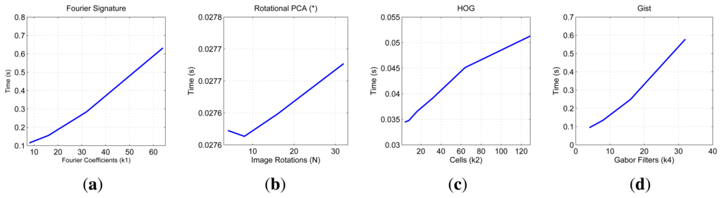 As far as step time is concerned, gist is the quickest algorithm. HOG presents similar results when the number of cells k2 is lower than 16. Fourier Signature presents a higher computational cost, and it increases as k1 does.