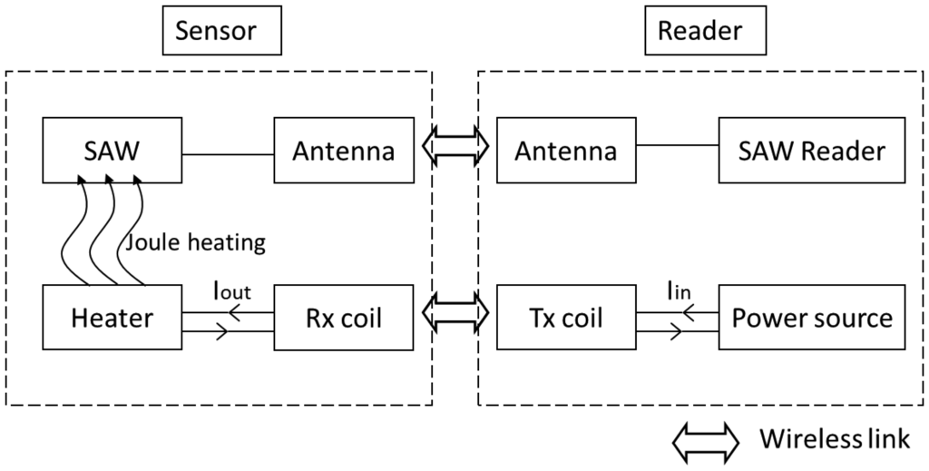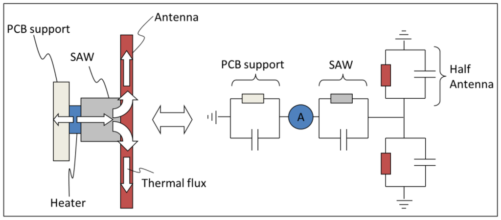 Nevertheless, all of these solutions are essentially miniaturized versions of the standard Pirani gauge. The operating principle is identical. This means that the sensors have to be wired to their conditioning electronics, and the need for active electronics next to the sensor is already a big enough constraint to make the existing MEMS Pirani gauges a non-viable solution for a whole range of possible applications where small, embedded, low-cost, accurate and maintenance-free “patch” sensors would be needed. In this case, the ideal solution would be a passive and wireless Pirani device. To realize such a sensor, only two functions would actually have to be implemented in a passive and wireless way: heating and temperature monitoring. For instance, a hot wire connected to a flat spiral coil designed for efficient energy transfer via inductive coupling would already constitutes a reasonably good passive and wireless low-pressure sensor. The “patch” made of the wire and the coil would be mounted inside a vacuum chamber. Provided that the vacuum chamber has a glass window, heating energy would be transferred to the coil using inductive coupling. This energy would be dissipated in the hot wire, making its temperature change. And the pressure-dependent temperature would then be monitored from outside using an IR-thermometer. If possible in principle, this solution would be quite hard to implement and use. First of all, the accuracy of the IR-thermometer would not be good enough to allow for an accurate determination of the inner pressure. In addition, IR-thermometer would be easily blinded by hot gases flowing around the sensor. To solve these two issues, one could rely on another “more robust” frequency range to transmit the temperature information and use a more accurate measuring principle. One possible solution would be to use a Surface Acoustic Wave (SAW) temperature sensor instead of the hot wire. SAW sensors are small, robust, passive and wireless. An extensive literature exists on the working principles and possible applications of SAW wireless sensors [6,7], notably at high temperature [8–10]. Off-the-shelf SAW sensors can operate at 2.45 GHz and withstand temperatures up to 300 °C for thousands of hours. The temperature accuracy achieved in wireless and passive mode is better than ±0.1 °C even in aggressive and perturbed environment [11]. Therefore, a heated SAW temperature sensor could certainly constitute a good wireless and passive low-pressure sensor. The additional elements that would be needed here are (again) a coil for wireless energy transfer, a resistive heater connected to the coil and attached to the SAW device, and an antenna for remote interrogation of the SAW device (for temperature monitoring vs. pressure).