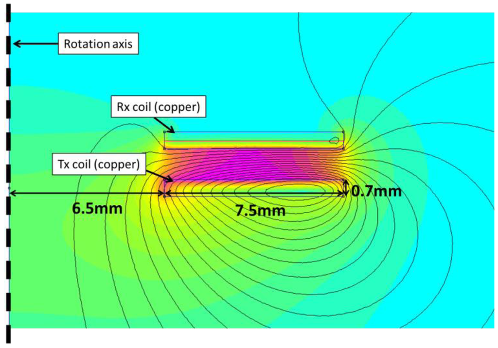 The power transmitting coils were modeled using FEMM. The layout is presented in Figure 5. The solution region was chosen to be a sphere with a radius of 40 mm. The Tx coil was positioned on the equatorial plane. The sphere was filled with air. Asymptotic boundary conditions were applied on the outer boundaries. The individual windings were not considered and each coil was approximated as a flat copper disc with a circular hole in its center.