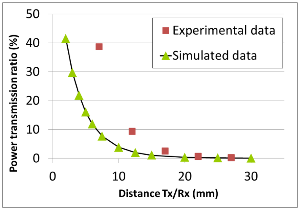 The ferrite core and ferrite support were not considered. Indeed, we observed–using FEMM models including these two elements–that they have almost no effect on the power transmission ratio. A current of 1 A was injected in the Tx coil, resulting in a current density of 0.19 MA/m2. The AC frequency was 125 kHz. The induced magnetic field is also shown in Figure 5 (field lines and field density). The induced current was computed in the Rx coil, along the center line marked in red. As a very first approximation, the average value along the line was considered to be the average induced current in the Rx coil. The computation was performed for different Rx/Tx distances (center to center), ranging from 2 mm to 30 mm. The power transmission ratio was given by the squared ratio between the induced and injected current densities (the respective impedances of the Rx and Tx coils were considered equal). The power transmission ratio is plotted in Figure 6. Additionally, the two coils were characterized experimentally. The Tx coil was fixed in front of the Rx coil, which was itself mounted on a sliding rail. This time, a constant voltage (Uin) of 15 V was injected in the Tx coil. The induced voltage (Uout) in the Rx coil was recorded as the Rx/Tx distance was increased. The respective impedances of the Rx and Tx coils were again considered equal and the power transmission ratio was given by (Uin/Uout)2. It is also plotted in Figure 6. There is a reasonably good agreement between experimental and simulated results above 15 mm. The experimental power transmission ratio is actually better than the computed one. The rough approximations used to compute the induced current as well as the additional capacitance used to generate a resonance at 125 kHz and therefore improve the transmission efficiency might account for the observed discrepancy, which strongly increases at short distances. However, the agreement is already good enough to validate the model as a first approximation and allow for its use as a simple design tool if the Rx/Tx distance is bigger than 15 mm.