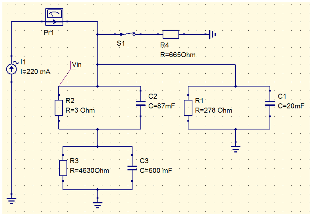 As already mentioned above, it is possible to use a simple circuit simulator to compute the thermal behavior of the WiPirani. The main step consists in converting the physical layout into its equivalent RC circuit, using a simple thermal-electrical analogy. The principle of the conversion we made is described in Figure 7. To calculate the equivalent resistance and capacitance of the different elements, the only parameters we used were the thermal conductivity, specific heat capacity, density and geometrical dimensions of these elements. The analogy between Ohm's law for electrical circuits and the Fourier's law of heat conduction and the analogy between the electrical and thermal capacitances yield the following relationships. The equivalent capacitance is directly equal to the heat capacity, one farad (F) corresponding to one J/K. The equivalent resistance is directly equal to the thermal resistance, one ohm (Ω) corresponding to one K/W. For one half of the PCB micro-strip antenna (made of FR4 with a thermal conductivity λ of 0.3 W·K−1·m−1, a density ρ of 1,850 kg/m3, a specific heat capacity Cv of 600 J·kg−1·K−1, a length L of 25 × 10−3 m and a cross-section S of 9 × 10−6 m2) we obtain the thermal resistance Rant = (1/λ)·(L/S) ∼9,260 Ω and the thermal capacity C = ρ·L·S·Cv ∼250 mF. In the equivalent thermal circuit, the antenna is made of two half antennas ‘in parallel’ because the SAW sensor is physically connected to the middle of the dipole antenna. Therefore, using electrical transformation laws for parallel circuits, it can be represented by one single circuit with Rant = 4,630 Ω and Cant = 500 mF. The equivalent resistance and capacitance of the SAW sensor housing (made of Kovar) and its FR4 support were computed in the same way. The obtained values are reported in the QUCS model presented in Figure 8. To take into account the pressure-dependent effect of the surrounding gas, an additional resistor must be used. The resistor models the energy leak into the gas. This resistance decreases when the gas pressure increases. It is known from [13] that the thermal conductivity of air in our present case can be approximated by λ = 0.592·S·P, where S is the gas-sensor surface contact area and P is the pressure in Pa. With S∼25.4 × 10−6 m2 (S is equal to the whole SAW sensor surface minus the bottom surface glued on the FR4 support minus the lateral surface in direct contact with the antenna) a sudden ±100 Pa (i.e., ±1 mbar) pressure variation can therefore be modeled using a 665 Ω resistor. In addition, a programmable switch can be used to model pumping steps (see Figure 8).