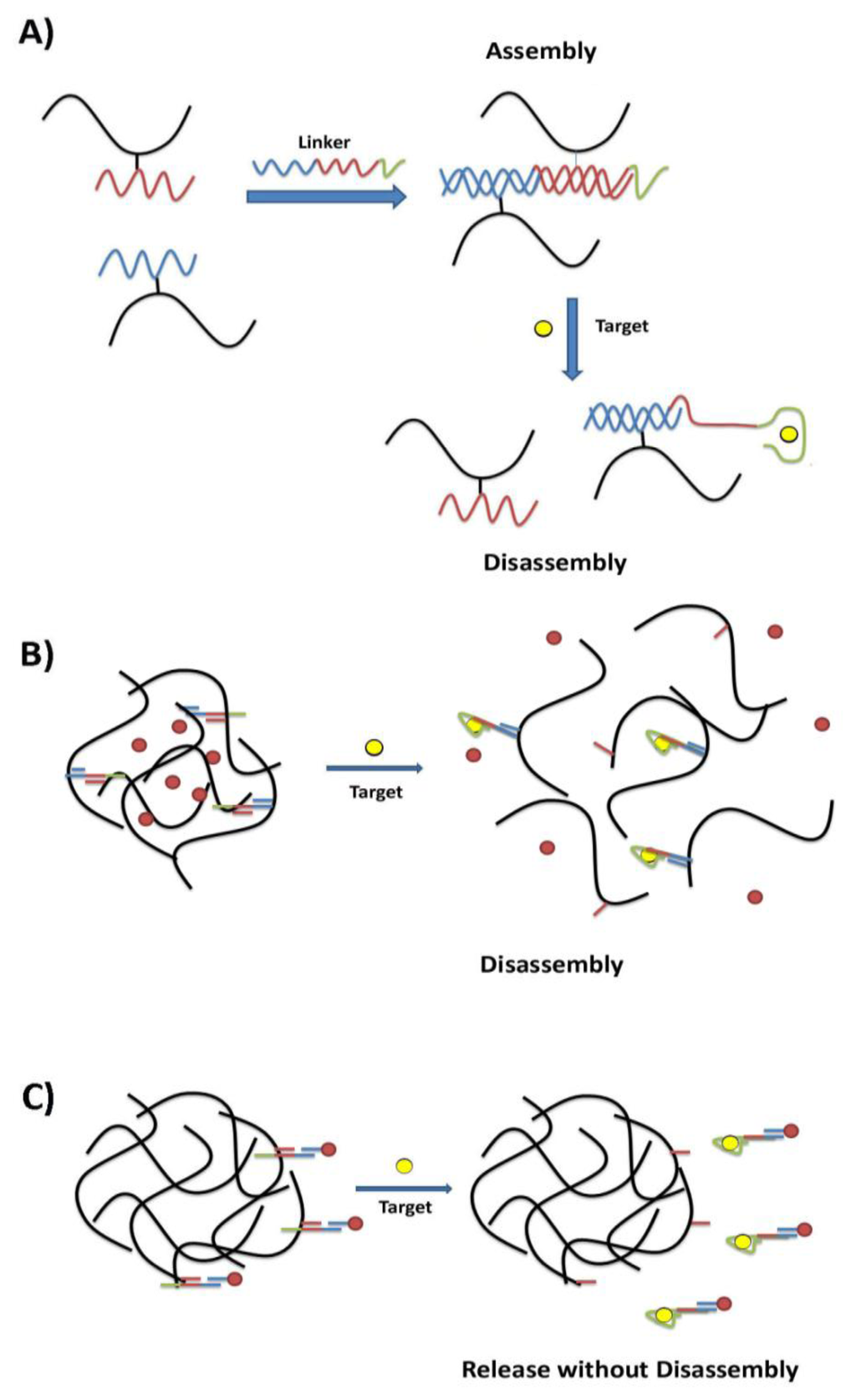 Hydrogels are one class of materials that displays stimuli-responsive changes in their structural network []. Hydrogels are composed of a crosslinked hydrophilic polymer network that readily takes up water. The amount of swelling is influenced by conditions such as pH, ionic strength, temperature, light, electric field, and solvent choice and these parameters are often exploited in stimuli-responsive hydrogels []. In recent work, DNA aptamers have been used to translate the recognition of a specific analyte into the controlled phase transitions of a hydrogel material. Tan and coworkers designed a hydrogel system where the polymer gel was initially crosslinked by the hybridization of DNA tethered to the polymer subunits with a rationally designed DNA linker strand []. (See Figure 1A) The linker strand was designed to have an aptamer domain (ATP aptamer) in addition to segments partially complementary to those sequences conjugated to the polymer subunits. As a result, in the presence of the aptamer's target, preferential binding to the molecular stimulus leads to the break-up of the crosslinks and the disassembly of the gel. This disassembly event could therefore be exploited to achieve target-driven payload delivery. (See Figure 1B)