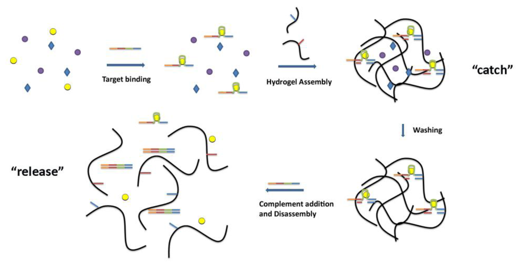 Hydrogel systems could also be adapted as smart materials for “catch and release” []. (Figure 2) Mi and coworkers presented a method to separate a specific target from a mixed system using DNA aptamers incorporated into a reversible hydrogel system. In this system, a crosslinker strand was prepared containing three key domains: (1) an aptamer sequence for binding the target of interest, (2) sequences that are complementary to the DNA-polyacrylamide conjugates for assembly of the hydrogel, and (3) a “toehold” domain to initiate hydrogel disassembly. The crosslinker strand was incubated in a complex mixture containing the target. After target binding, the polyacrylamide-DNA conjugates were added to assemble the hydrogel. Washing removed any nonspecifically-held species, and the purified target was “released” through disassembly of the gel, by introducing a strand that is complementary to all domains on the crosslinker. This strand unzipped the crosslinker strand from the DNA-polymer conjugates starting at the single- stranded toe-hold sequence. Using this catch and release approach, the authors were able to separate ATP from a pool of ATP and GTP, as well as α-thrombin from a pool of α-thrombin and bovine serum albumin. This example shows that aptamer-based smart materials may find applications in molecular separations for environmental and medical applications.