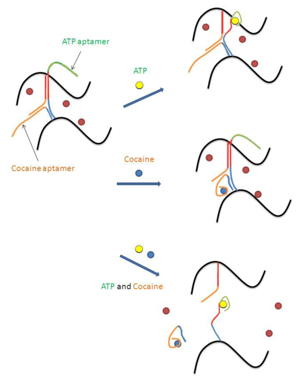 In the presence of only one target, the respective aptamer segment dissociated from the three strand complex, however enough inter-polymer strand interactions were still maintained to keep the hydrogel together. It was only when both targets were present that the hydrogel reverted to a solution state. Analogs of both targets, such as GTP or benzoylecgonine, were unable to initiate hydrogel disassembly, thanks to the specificity of the two aptamers. Similarly, an “OR” gate was assembled such that the interaction of either aptamer with its respective target led the hydrogel to revert to the solution state. Again, this change could not be achieved using analogs of the targets. This work demonstrates the potential of the aptamer-hydrogel smart materials as a controlled release system with possible applications in biosensors, nanomechanical devices, molecular electronics, and drug delivery devices.