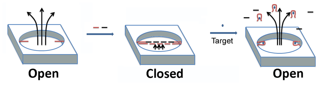Porous substrates such as nanoparticles or nanostructured surfaces can serve as an excellent foundation for smart materials. Synthetic nanopores are of great interest for several applications, including as potential mimics of biological gated ion channels. Typically, controlled transport through these synthetic pores is achieved by integrating polymers responsive to chemical or physical stimuli. Aptamer-target binding as a means of control of transport through these nanopores has also recently been investigated. Recently, 20 and 65 nm radii glass nanopores were gated by covalently attaching cocaine-binding aptamers to their surfaces []. Using cyclic voltammetry of a redox probe, ferrocene dimethanol, the authors were able to demonstrate that aptamer binding to cocaine triggered a conformational change in the aptamer that allowed the orifice of the nanopore to be reversibly switched from a more blocked to a more opened state.
