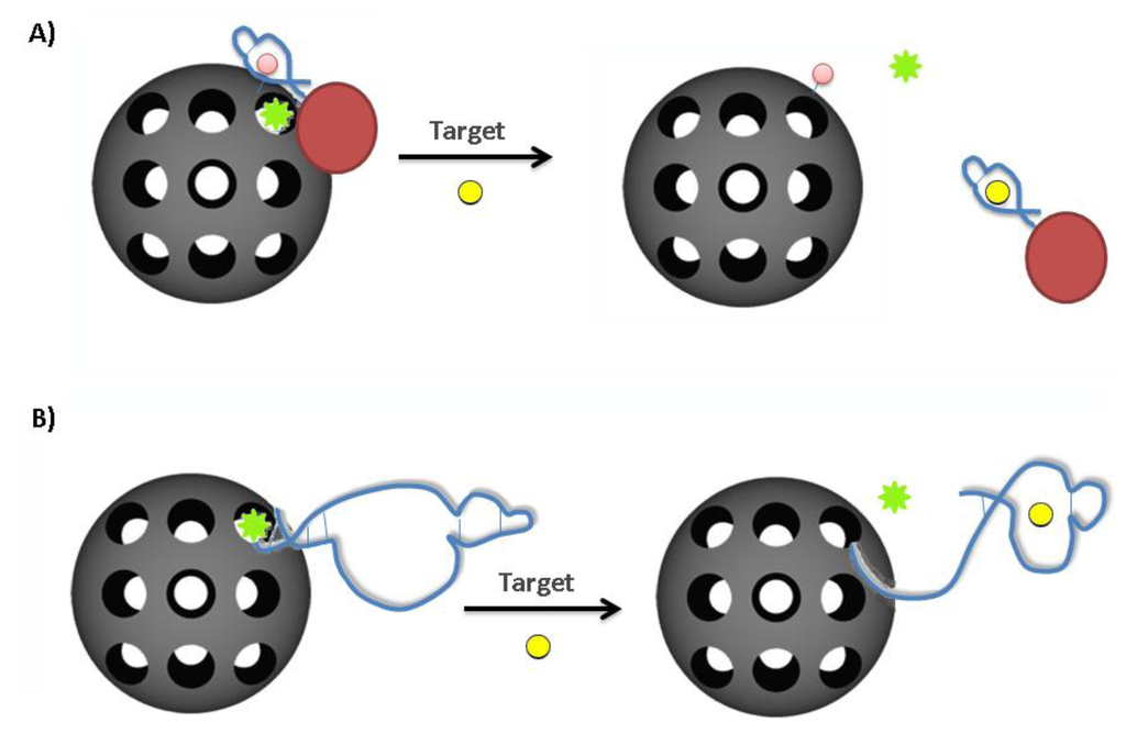 Gated nanoparticles typically make use of a mesoporous nanoparticle and a stimuli-responsive, bulky stopper molecule which can effectively block the pore. In these systems, the nanoparticle will serve to protect and transport a given payload and the “gate” will only open to release the payload upon proper stimulus []. This has been achieved previously using antibodies and enzymes and recently aptamer-based systems have also been receiving significant attention []. Bioresponsive mesoporous silica nanoparticles have been prepared by capping the pore openings with gold nanoparticles (AuNPs) decorated with ATP aptamers [] (Figure 5A). An adenosine derivative immobilized on the outer surface of the silica NPs provided a binding site for the ATP-aptamer-coated AuNPs. The AuNPs blocked the pores of the silica nanoparticles, preventing the release of a pre-loaded fluorescein dye payload. The addition of free ATP led to a competitive displacement of the ATP-aptamer-coated AuNPs, uncapping the silica pores and allowing for the release of the dye payload. The rate of dye release was dependent on the concentration of ATP and it could not be triggered by target analogs (GTP, CTP, UTP). This system represents an option for a one-time “snap-top” release mechanism exploiting aptamer-target binding.