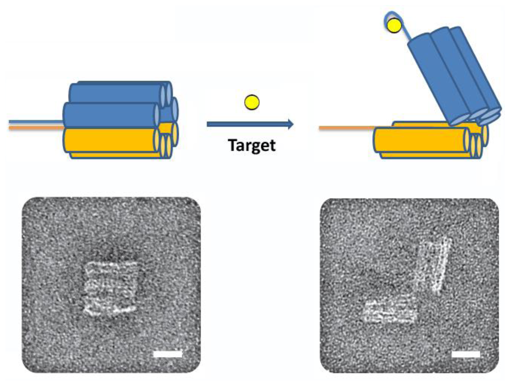 In a particularly innovative and exciting example, Church and coworkers created an aptamer-gated particle made completely of DNA []. This “nanorobot” was a hexagonal DNA barrel-shaped particle, prepared by DNA origami, attached by single-stranded hinges at the back and two DNA aptamer-complement duplexes as locks in the front (see Figure 6).