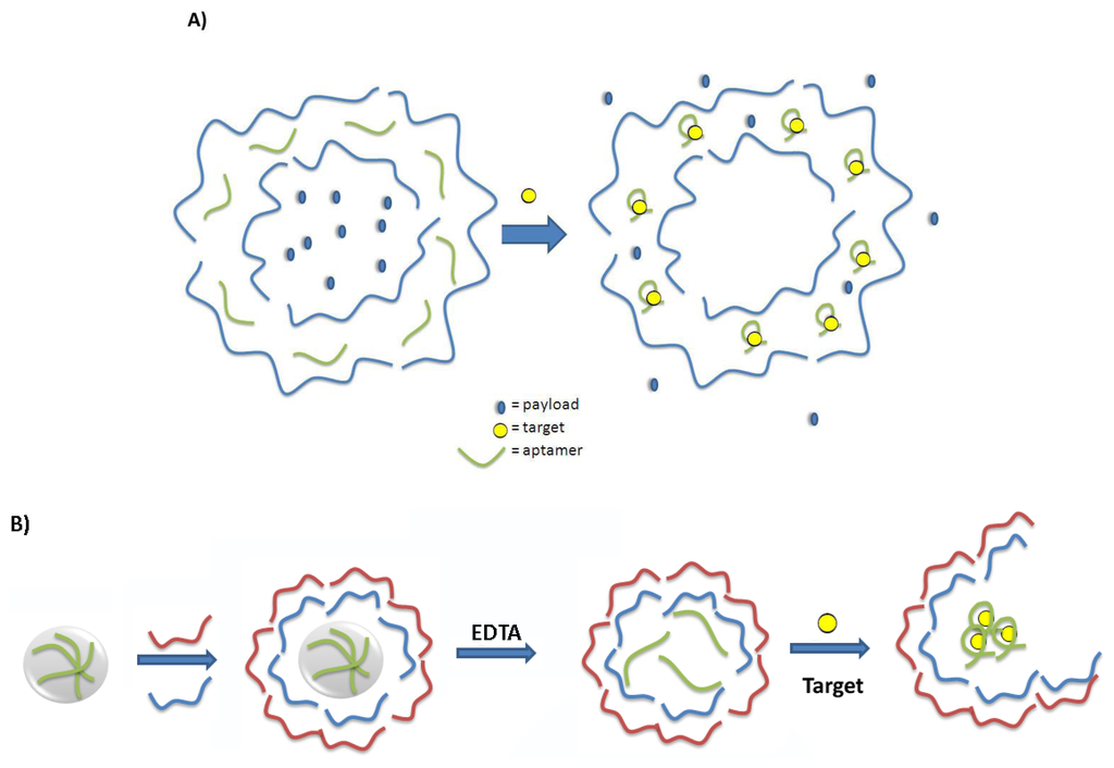 Another popular method for the preparation of smart materials is the Layer-by-Layer (LbL) technique. This technique is based on the sequential adsorption of oppositely charged molecules onto a charged substrate []. The nature of the assembly process leads to precise, nanoscale control of film thickness and composition through the appropriate choice of the components and the number of layers, allowing for these films to be tailored to their specific application. Methods to change the permeability or initiate the destruction of these multilayered polyelectrolyte films or microcapsules are generating increased interest in the development of smart materials for controlled release of a molecular payload []. There has been more recent attention on designing systems whereby the detection of a target molecule will lead to changes in the polyelectrolyte film and concomitant release of payload. As aptamers are negatively charged biopolymers, their incorporation into polyelectrolyte films as molecular recognition elements has been explored. The successful incorporation of a DNA aptamer into a multilayered polyelectrolyte thin film was first reported in 2009 []. It was found that the matrix was flexible enough to permit a model aptamer to fold into its active conformation and to bind the target strongly and specifically, confirming that an aptamer can confer its affinity and specificity for its cognate target to the nanoscale polyelectrolyte film. The targeting ability of aptamers has been used to direct the delivery and internalization of stimuli-responsive polyelectrolyte-based microcapsules []. Aptamers have also been incorporated into the walls of hollow polyelectrolyte microcapsules in order to gauge the effect of aptamer-target binding on the permeability of the capsule walls []. In this proof-of-concept experiment, the diffusion of the dye sulforhodamine B through the walls of a series of polyelectrolyte microcapsules was monitored using Fluorescence Recovery After Photobleaching (FRAP). In microcapsules containing the sulforhodamine B aptamer within the multilayers, the diffusion coefficient for the dye was nearly an order of magnitude greater than either microcapsules containing a random DNA oligonucleotide, or those comprised of synthetic polyelectrolytes alone. Although the mechanism behind this change in permeability has yet to be confirmed, aptamer-target binding and any associated change in aptamer conformation or volume may lead to the creation of pores within the coating. These pores, in turn, could increase the permeability of the microcapsule wall. This work furthers the possibilities for use of aptamers in smart-responsive coatings for controlled release (Figure 7A) and for innovative sensing platforms [].