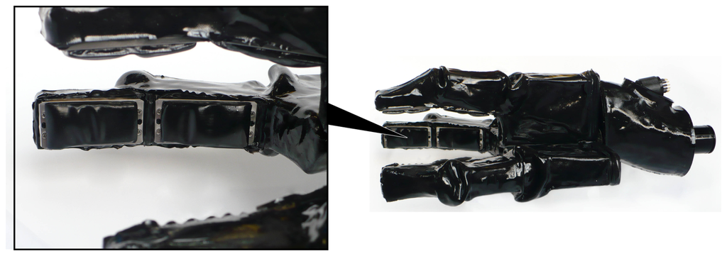 SeeGrip (Figure 1) is a three-fingered deep-sea capable hydraulic gripper with multimodal sensing functionality and has been designed to work under ambient pressure of at least 600 bar which corresponds to a depth of 6 km under water. Detailed information regarding the hydraulic finger actuation is provided in a recent publication []. Information regarding the various sensing modalities, pressure tolerant electronics for deep-sea operations, and the low level processing architecture can be found in some other publications [,].