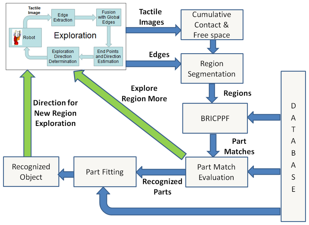 The widest unexplored cone exploration strategy is also very effective in dealing with objects of complicated shapes and can work for any configurations of the manipulator and gripper systems. It can also be argued that a complicated exploration procedure closely tied with recognition state might not even be necessary for optimal haptic recognition, especially when only a few exploration steps are enough for object recognition. We have proven that allowing the exploration to function independent of the current state of recognition works fine with robust object recognition being achieved in only a few exploration steps. In less than 10 exploration steps, exploring new regions on the object surface might be sufficient and even the most optimal exploration technique since greater information about the shape and size of the object can be gathered using this approach. We are heading towards a future where robot appendages will be equipped with a tactile skin consisting of a large number of tactile sensors. The BRICPPF approach can be directly applied to such a situation for robust object recognition, object localization, robot self localization in the environment, and for robot calibration.