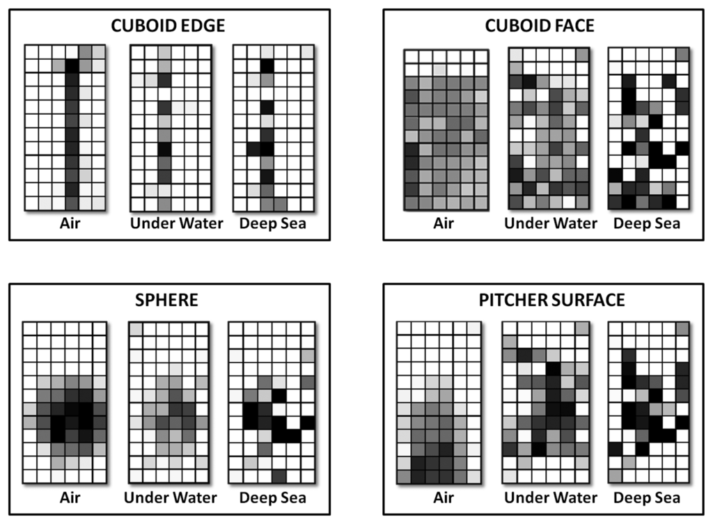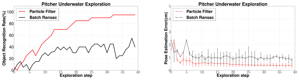(c) Comparisons with other approaches: In this article, haptic underwater object recognition and localization has been addressed for the first time in literature. Comparisons can be drawn with other approaches for terrestrial environments. The most relevant previous work [] comprises of the application of particle filters and histogram filters for 3 dof localization of 2D objects using a dense array of tactile sensors similar to the SeeGrip sensors. Occupancy maps of objects built with real sensor based ground truth are used as a database. The histogram filter with 10,000 bins was able to successfully achieve 100% recognition rates with nine sensor readings with a database of five objects. The objects were localized to within 1.3 mm position error. With our BRICPPF approach, we were able to achieve 80%–100% recognition success with 5–10 grasps for a database of five objects in the underwater case and in only three exploration steps for the ground based environments. Pose estimation error was around 5 mm. It should be noted again that we deal with 3D objects, and consider complete 6 dof localization. Also, for underwater scenarios, the position errors associated with manipulator systems and tactile sensors are much greater than ground based systems.