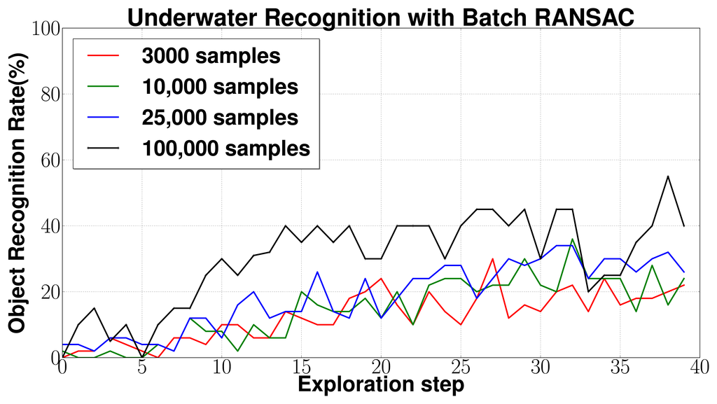 The ICP augmented sequential state estimation on the other hand ensures that if, at any instance during the course of exploration, a hypothesis is detected in the vicinity of the correct object and the correct pose, it will be tracked and successively evolved to the correct pose. This results in high recognition rates (Figure 14). These comparisons have been drawn with a high number of samples (100,000) used in Batch RANSAC to ensure comparable computational times. The ICP and Batch RANSAC based resampling efficiently allows managing the high dimensionality of this 7 dimensional problem, which is otherwise computationally prohibitive for standard Bayesian methods. Therefore, only 100 particles are required in the complete state space. The use of feature based RANSAC within the sequential state estimation also allows the handling of large databases. While the 45 object database consists of more than 90,000 object surface feature points, feature based pruning allows the database to be pruned to only 3,000 points for each input sample which represents only 3.33% of the database.
