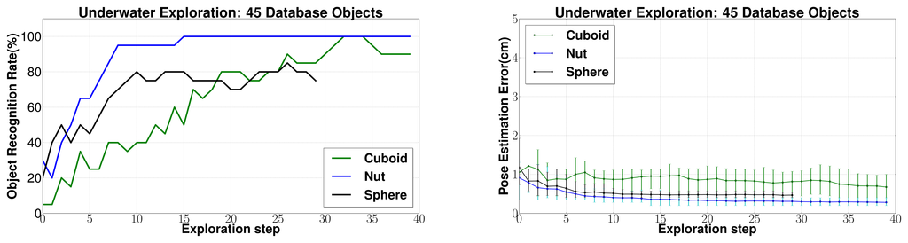 Similar experiments were conducted with tactile data collected from the ground based experiments. The recognition and localization results for three different objects are shown in Figure 17 using a database of 45 objects. As seen for the underwater experiments, the recognition rate increases steadily and pose estimation error decreases steadily with increasing object surface being explored. 80% to 100% object recognition rates were achieved after only 5–7 exploration steps. Also, the 6 dof pose estimation error was estimated to be well below 1 cm for all objects. This is because of the increased quality of contact tactile data in the case of ground based exploration as compared to underwater exploration which can also be seen in Figure 12. Also, the EEF positioning error associated with the Mitsubishi PA10 manipulator used for ground tests is much lesser as compared to that of Orion7P manipulator for underwater experiments.