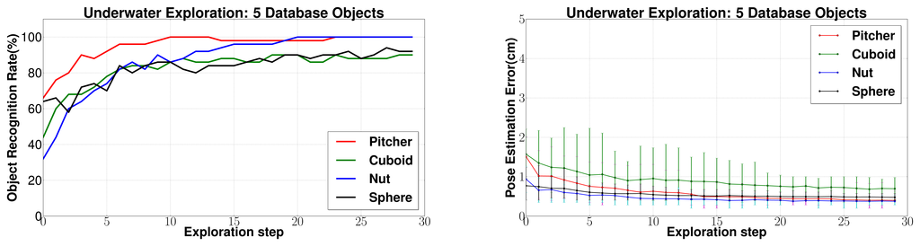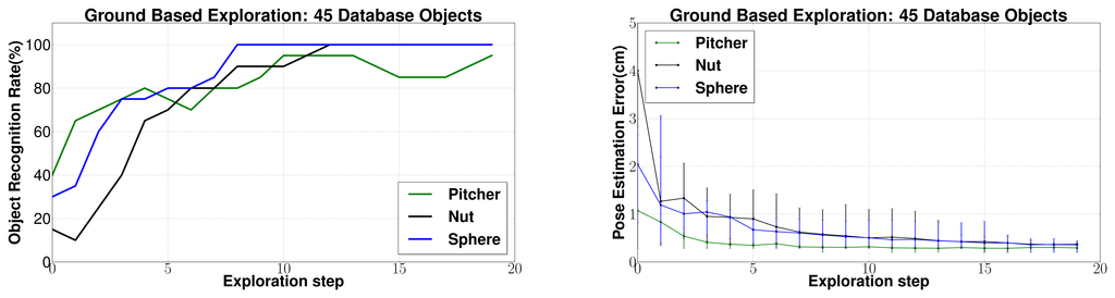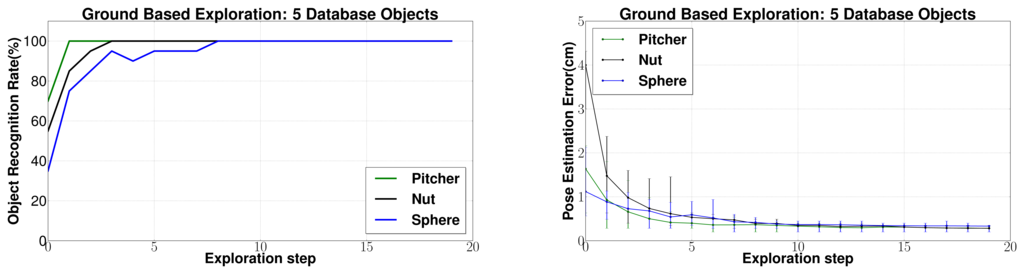 The results with a smaller database of five objects is shown in Figure 18. An even better performance can be seen in this case and 80% to 100% object recognition rates were achieved only after three exploration steps for all the objects. Also, the average 6 dof pose estimation error was estimated to be below 0.5 cm for all objects.