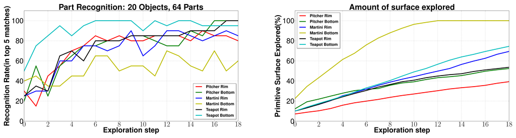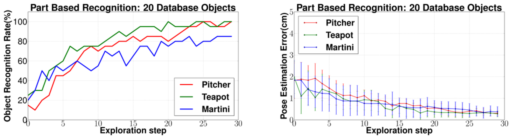 For part fitting based recognition (Section 5.3), the parameter values of N = 100, t = 50, R = 100, Q = 50 were used for Algorithm 2 and K = 100 for Algorithm 3. The object recognition and pose estimation error results for three objects Pitcher, Teapot and Martini glass (as shown in Figure 9) are shown in Figure 20. It can be seen that 80%–100% recognition success rates were achieved in 15–20 exploration steps, and less than 1 cm pose estimation errors were also achieved.