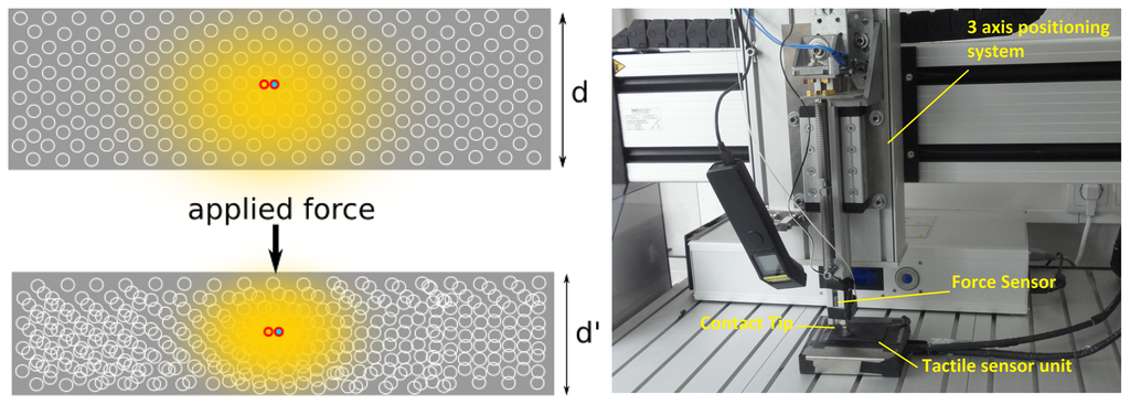 The working principle of the fiber optic sensors is depicted in Figure 4 (left). Each sensor element (sensel) consists of two optical fibers and a foam material. The endings of the optical fibers are placed within the foam or directly in front of it. One of the optical fibers leads light into the cell structure of the foam. The second optical fiber works as a brightness sensor. The scattered light in the foam structure is sensed and transferred to a photo-transistor. Application of force to the foam structure leads to a compression of the foam which results in a change in the scattering of the emitted light. This change is sensed and transferred to the photo-transistor. The intensity of the sensed light is directly proportional to the amount of compression of the foam in front of the fiber optic element.