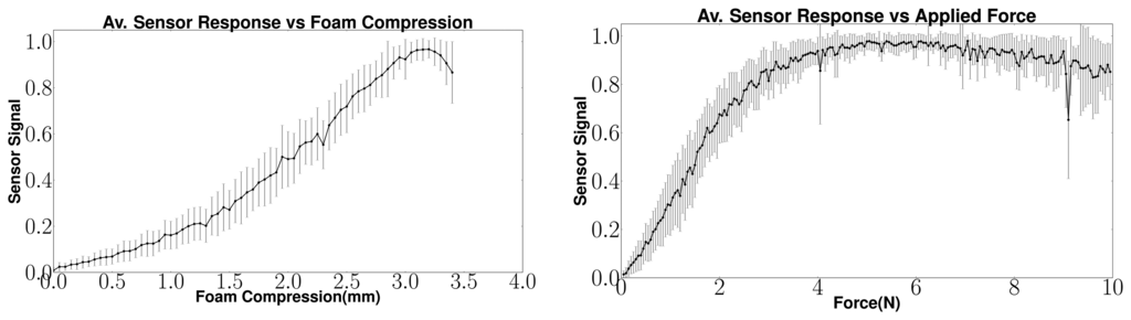 For observing the signal response, a fiber optic sensor with 72 sensel elements was tested on a Metaksa Testbench shown in Figure 4. The 3-axis testbench allows the precise positioning of a contact tip on the sensor unit such that each sensel can be compressed by the desired amount. A force sensor monitors the applied contact force. A 5 mm by 5 mm tip was used to gradually compress each individual sensel one by one. The response of the sensels was recorded along with the amount of foam compression and the applied force. The mean sensel response for all sensels (with standard deviation) is shown in Figure 5 w.r.t. the foam compression and the applied force. It can be observed that the sensor signal increases steadily with increasing foam compression. However, after about 80% of the foam compression (total thickness 4 mm), the sensor response drops. This is because the intensity of light reflected in the foam starts decreasing after the foam has been compressed beyond 80% of its thickness. This plot shows that the sensel signals can be directly used to interpret the amount of foam compression. The corresponding sensor response versus the applied force is also shown for clarity.