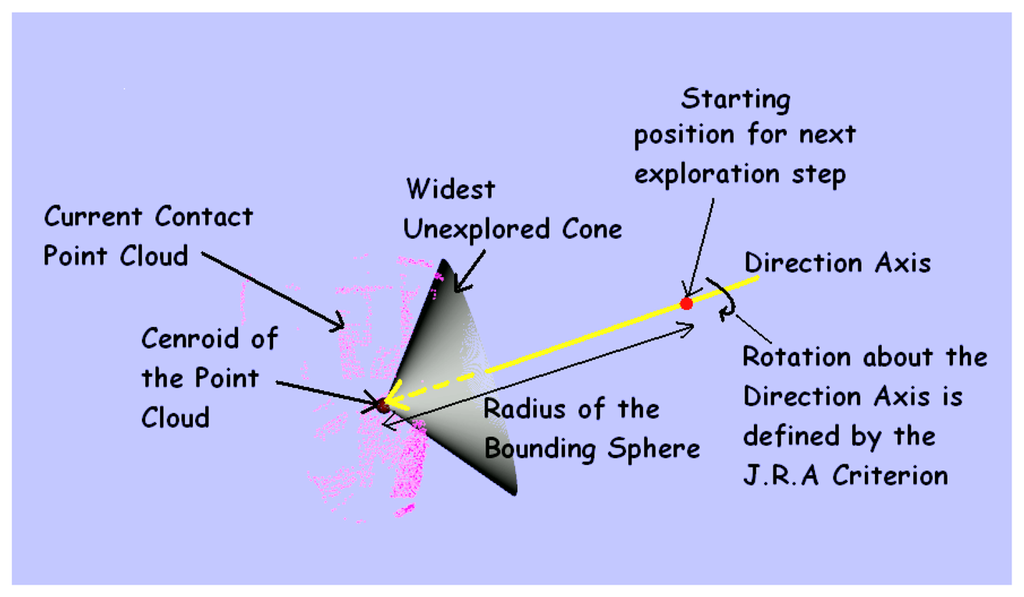 Firstly, a Coarse Exploration strategy is responsible for the motion planning of the robot arm to which the gripper is attached (see Figures 2 and 3). At time step t, the maximum unexplored region on the object surface is determined by the widest open cone formed by the contact points in , with its vertex at the centroid of (see Figure 6). The bounding sphere of the object is defined by a sphere of radius twice the maximum object size sobjmax with its center at the centroid of . The next exploration direction (for the normal vector of the middle finger's proximal tactile sensor) is defined by the axis of the cone, and the position of the wrist is given by the point where this axis intersects the bounding sphere. The direction and 3D position define 5 parameters for the wrist pose. The complete 6 dof pose of the wrist is determined by using the Joint Range Availability redundancy resolution technique []. Assuming the object to be in an obstacle free environment with a known position of the floor, collision free paths for the manipulator are planned from starting to the end configuration using Rapidly Exploring Random Trees based path planners [] and by assuming the bounding sphere to be occupied. Finally, the wrist is moved straight in the new exploration direction till there is contact with the object (detected by force-torque sensors).