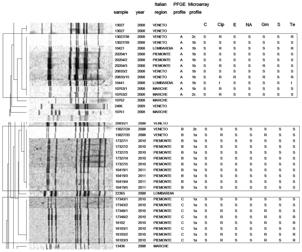 The combination of two molecular methods (microarray and PFGE) seems to confirm the genetic similarity of strains clustered from regions of northern Italy (Piemonte, Veneto and Lombardia) and to establish a possible correlation. The mechanisms that induce genetic diversity in Campylobacter, however, still remains poorly understood. It is well known that C. jejuni is naturally competent and this aspect, combined with its high rate of recombination, can contribute to its genetic diversity, as shown by the horizontal intra-species and inter-species genetic exchange in C. jejuni [46]. Molecular typing holds a significant role in epidemiological investigations and surveillance networks, improving the ability to detect outbreaks, thus representing a tool to trace back sources and pathogens throughout the food chain. Its use offers opportunities to better understand epidemiology, ecology and population genetics of food-borne pathogens. However further strategies are needed to monitor and control bacterial infections in food production and new guidelines are required for limiting the use of chemicals only to those cases they are strictly necessary. Moreover constant monitoring of the antibiotic resistance development from enteropathogenic bacteria is essential to understand the trend and to plan efficacious intervention strategies.