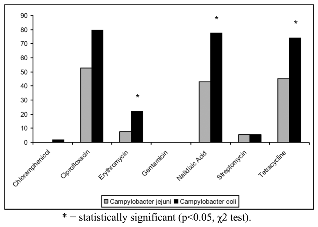 The most common multiple resistance patterns were ciprofloxacin-nalidixic acid-tetracycline (50.52%), ciprofloxacin-erythromycin-nalidixic acid-tetracycline (14.73%), ciprofloxacin-tetracycline (12.63%) and ciprofloxacin-nalidixic acid (9.47%) (Table 3).