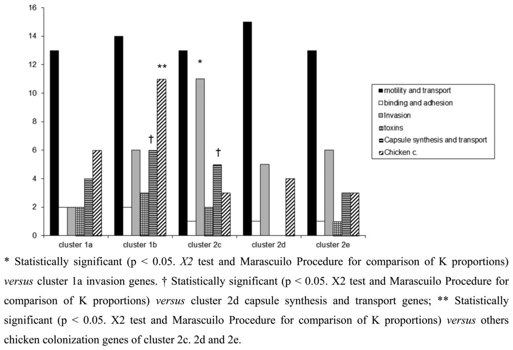 The microarray analysis showed a different level of discrimination between clusters based on different virulence gene targets as shown in Figure 3. Virulence genes were present in almost all clusters, with the exception of cluster 2d, in which no toxins, capsule synthesis and transport genes were detected. Moreover a statistically significant presence of genes associated to invasion, capsule synthesis, transport and chicken colonization was observed in clusters 1b and 2c, as presented in Figure 3.