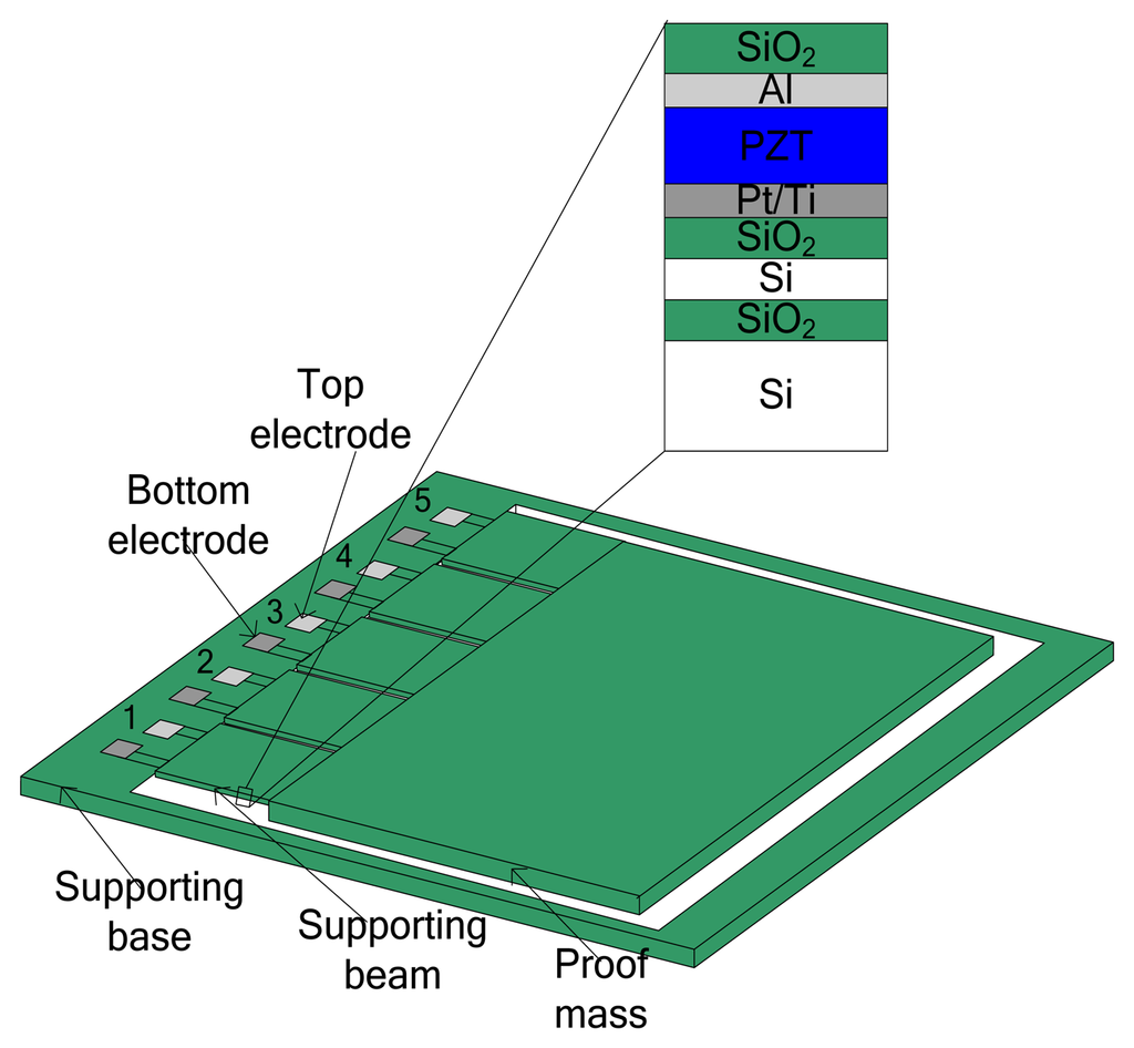 The cross-section structure of the MEMS piezoelectric cantilever array is shown in Figure 1. The cantilever array device is designed to resonate at a specific low vibration frequency by using a large integrated Si proof mass. The bending results in a strain distributed along the beam, which is then converted to electrical energy through the transverse mode (d31) piezoelectric effect. The Pt/Ti and Al electrodes are patterned in order to generate strain in parallel to the electric field, which forms the d31 mode of the piezoelectric element. When an input vibration applies acceleration to the beam structure, the effective mass converts the input acceleration into force. The relative displacement causes the PZT layer to be tensed or compressed, which in turn induces a charge shift and accumulation due to the piezoelectric effect. Electrodes collect the generated charge and electrical damping results. The magnitude of the electric charge voltage is proportional to the stress induced by the relative displacement. Material properties and structural parameters of the piezoelectric energy harvester are listed in Table 1.