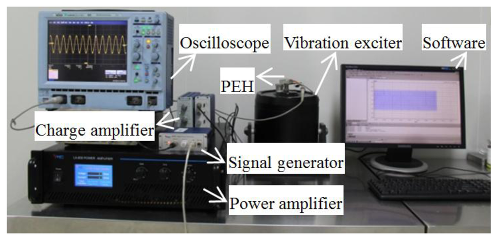 In order to measure the output characteristics of the piezoelectric energy harvester, a vibration testing system is employed. A schematic drawing of the experimental setup for PEH system is shown in Figure 10. It consists of a vibration exciter, an accelerometer, a power amplifier, an oscilloscope, a signal generator and a charge amplifier. An accelerometer is assembled on the vibration exciter together with the cantilever array device for the acceleration measurement. The vibration signal is generated from the signal generator, amplified via the power amplifier and finally utilized to control the vibration amplitude and frequency of the shaker. Accordingly, the piezoelectric cantilever device will undergo excitations and generate output voltage signal which is recorded to the oscilloscope. Acceleration signals will be measured by the accelerometer and amplified by the charge amplifier, and then shown on the monitor of the computer. The photo of the experimental system for testing the MEMS piezoelectric energy harvester is shown in Figure 11.