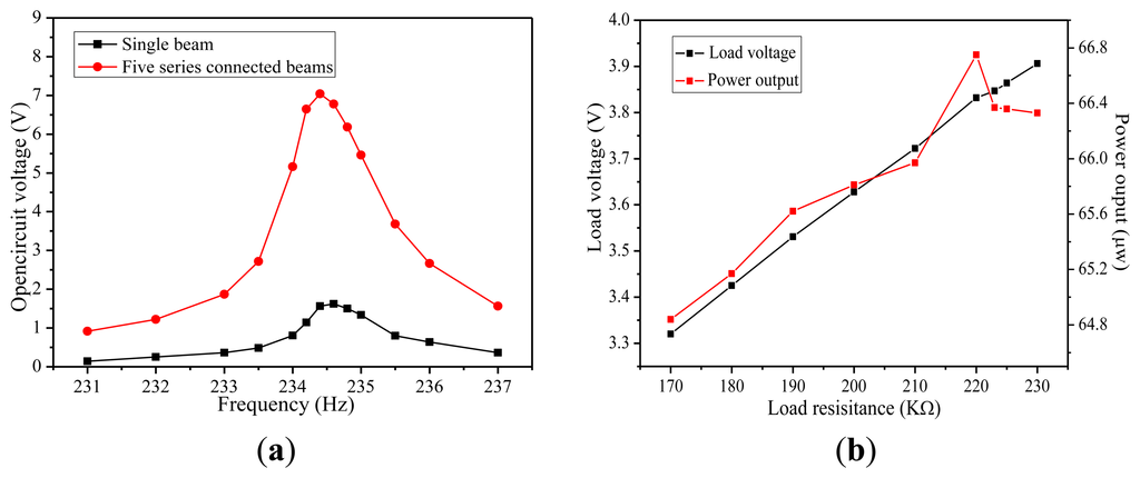 First, the respective characteristics of the MEMS piezoelectric energy harvester are measured, including the resonant frequency, output voltage, output power and optimal load. Figure 12a shows the output voltage of a single PZT beam and five beams connected in series as the vibration frequency swept from 231 Hz to 237 Hz at 5 m/s2 vibration acceleration. As can be seen, the maximum open circuit voltage is 1.62 V and 7.04 V at the resonant frequency of 234.5 Hz under 5 m/s2 acceleration, respectively. The error between the simulated and measured resonant frequency is about 4.2%. Figure 12b shows the load voltage and average power to the different loads at resonant frequency. As expected, the load voltage increases with the increased load, up to 3.91 V at 230 KΩ load. However, the power delivered to the load has a maximum value. The maximum output power of 66.75 μW is obtained at 5 m/s2 acceleration with an optimal resistive load of 220 kΩ resulting in a maximum power density of 5.19 μW·mm−3·g−2. The power density is calculated using the average power divided by the effective volume of the device, which is the volume of the entire beam and the Si proof mass calculated from the measured data in Table 1. Some main performance parameters of recent MEMS piezoelectric energy harvesters are compared in Table 2.