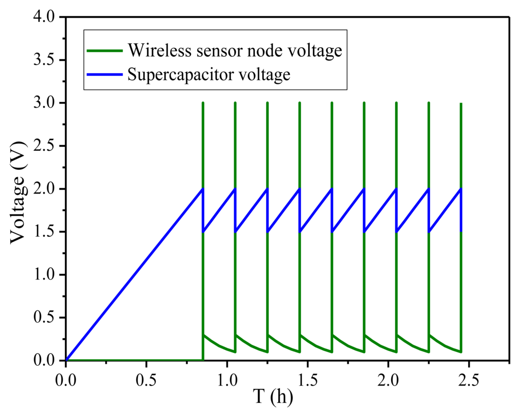 The next experiment shows the performance of the power conditioning circuit. Figure 12 shows that the proposed power MEMS system can successfully drive the wireless sensor load when the temperature-humidity sensor node transmits signals. As shown in Figure 13, when the voltage across the super-capacitor is charged to 2 V, the instantaneous bleed-off circuit begins to work and the voltage regulator will start up, supplying 3.3 V to the wireless sensor node load. The super-capacitor's voltage will begin to drop while the energy is supplied to the load. When the voltage across the super-capacitor drops below 1.5 V, the output voltage level of instantaneous bleed-off circuit will become low, so the voltage regulator shut off again. When the super-capacitor voltage is charged to 2.0 V next time, the DC-DC converter will start up again. Through the test, the working cycle time of the wireless sensor node is 0.185 h. In the proposed circuit, the energy of super-capacitor discharging is shown in Equation (15) and the efficiency of the energy management is calculated by Equation (16), respectively: