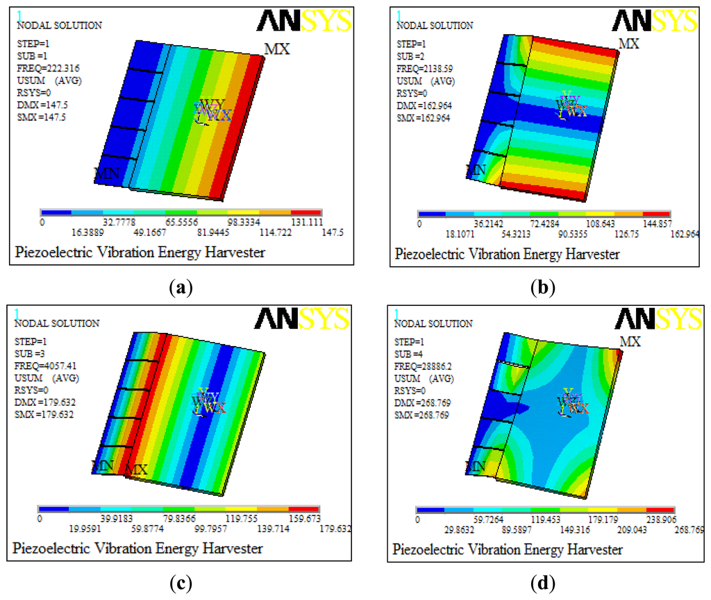 A modal analysis is conducted firstly for the established model to determine the vibration modes and corresponding resonance frequencies. The resonance frequencies for the first four models are 222.3 Hz, 2,138.6 Hz, 4,057.4 Hz and 28,886.2 Hz, respectively, simulated by using ANSYS software as shown in Figure 3. The horizontal color bar refers to the modal displacements of each point in the structure, and its unit is meters. However, the modal displacements here are not really physical displacements but the relative displacements, and they illustrate the vibration characteristics of the structure. The first resonant frequency (222.3 Hz) of the model makes it possible to use it in the low frequency range, which is always chosen for dynamic analysis to achieve the maximum power. Besides, there is a quite difference between the first frequency and the others, which ensures the stability of the piezoelectric energy harvester.