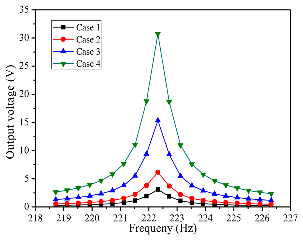Secondly, a harmonic analysis is implemented to calculate the response of the structure to cyclic loads over a frequency range, which can provide the curves between the induced voltage and the dynamic frequency. This can help the designer evaluate the dynamic traits of the results and any possible fatigue and crack problems to maintain the stability of the device. In the harmonic response analysis process, sinusoidal signal z(t) = u0sin(ωt) is forced on the whole structure in the poling direction of the piezoelectric patch. Figure 4 shows the curves between the induced voltage and the dynamic frequency in four cases. Case 1 and Case 2 show the electric potential of single beam and five series connected beams at 5 m/s2 vibration acceleration, respectively. Case 3 and Case 4 present separately the output voltages derived from single beam and five connected beams in series at 10 m/s2 vibration acceleration. All four simulation results indicate that maximum electric potential occurred at the first resonance frequency of 222.3 Hz and then declined rapidly. That is to say, the piezoelectric cantilever is only sensitive to the harmonic frequency. If the acceleration is twice as much as before, the value of output voltage is doubled, which is mainly due to the fact that harmonic analysis is a linear analysis. Besides, the output voltage of five beams connected in series happened to be nearly five times as much as that of single beam as a result of the symmetry of the piezoelectric vibration structure. The output voltage response of piezoelectric energy harvester can be seen distinctly under differing frequency exciting forces by the harmonic response, which provides the theory for further systematic dynamic analysis and the structure design of the energy harvester. These also provide an applied dynamic force analysis method, which can be used as reference for other analysis.