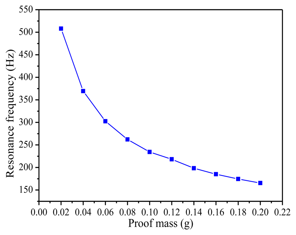 Figure 6 presents the relationship between resonance frequency of the piezoelectric energy harvester and the mass at the tip of the beam. The resonance frequency decreases sharply from 508.0 Hz to 165.53 Hz when the mass of the proof mass increases from 0.02 g to 0.2 g. As a result, by adjusting the mass of the proof mass, the resonance frequency of the piezoelectric energy harvester can be significantly changed to make it work better to meet the low frequency vibration needs.