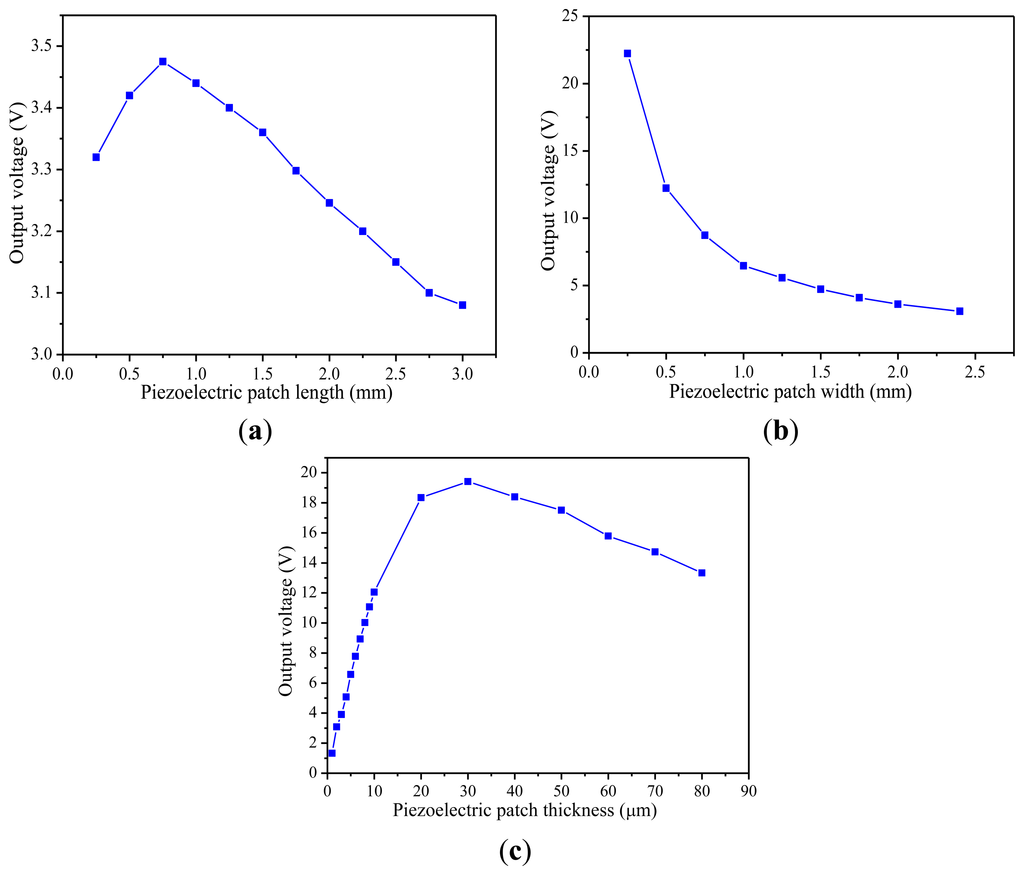Finally, to investigate the dependence of the output voltage on the parameters of the piezoelectric patch, additional harmonic analyses are done. Three plots of the relationships between them are shown in Figure 7. Figure 7a shows the dependence of the output voltage on the length of the piezoelectric patch. While other parameters remain constant, the output voltage first increases and then decreases with the increase of the length of piezoelectric patch. From Figure 7b, it is found that the output voltage decreases when the width of the piezoelectric patch is changed from 0.25 mm to 2.4 mm. The result in Figure 7c shows that the output voltage begins to increase first, and then decreases with the growth of the thickness of the piezoelectric patch. The analysis results show that the piezoelectric patch with the appropriate length and thickness should be less wide compared with the dimensions of substrate, which is well in agreement with the previous literatures [19].