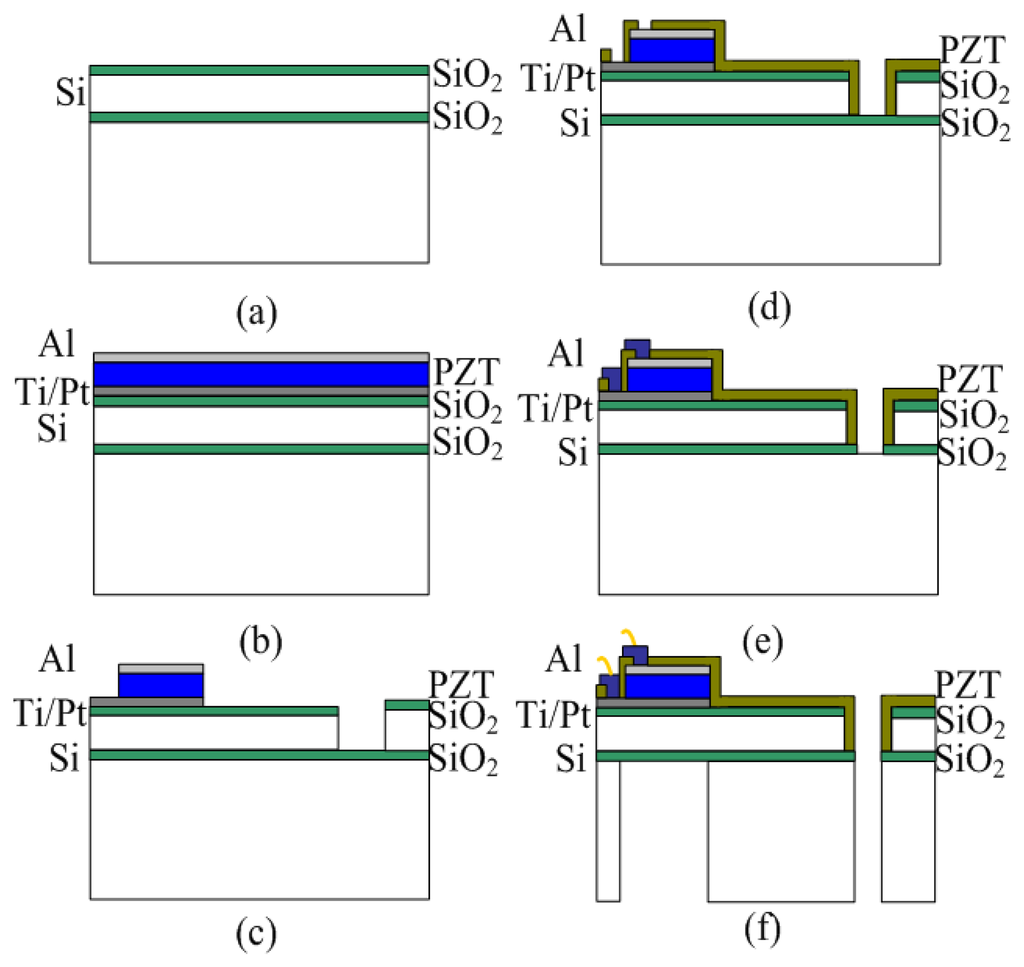 Sputter deposit Ti/Pt (bottom electrode), and Al (top electrode), spin coat sol-gel PZT piezoelectric layer.