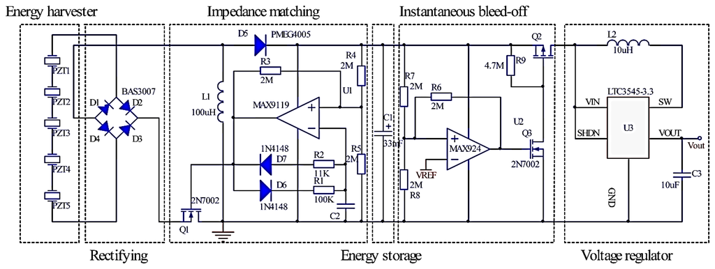 In order to drive the load successfully, the weak harvested energy should be accumulated in the energy storage element during the long period time because a wireless sensor node requires much more peak power than a piezoelectric micro power generator can produce. A super-capacitor C1 of 33 mF is chosen as a storage element in this energy harvesting system, which accumulates energy to enable efficient use for short power output bursts. The super-capacitor should be disconnected from the load during the energy accumulation stage to prevent energy leakage to the load, and is supposed to be connected to the load only if the accumulated energy is large enough to drive it. The instantaneous bleed-off circuit is composed of an ultra-low power voltage comparator U2 with hysteresis, the switching Q2, and Q3. The comparator monitors the super-capacitor's voltage and controls the super-capacitor's charging and discharging process. The switch is in charge of powering on or off the wireless sensor node. The hysteresis of a comparator creates two threshold voltage points: the upper one for super-capacitor charge voltage and the other lower one for the super-capacitor discharge voltage, which can control how much energy discharging from the super-capacitor.