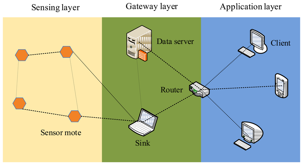 As a general wireless embedded platform, the MicaZ mote can not only measure 0–3 V with 0.01 mV resolution, but also be extended to monitor diverse other signals (such as temperature, humidity and vibration, etc.), so we used the MicaZ mote in our test-bed to support a closer monitoring of corrosion of RC structures. In our design, we consider mainly two issues related to the WSN platform: one is how to connect the corrosion-detection device to the MicaZ mote, and the other one is how to implement a wireless communication algorithm to effectively collect the corrosion data. Figure 1 shows the architecture of our test-bed. The sensing layer consists of a set of sensor motes, which will self-organize into a wireless network. The laptop, data server, or other Internet-accessing devices belong to the gateway layer which is responsible for collecting all the data sent by the sensing layer. The back-end application layer provides a visual interface for users as well as domain experts. As long as users can access the Internet, they can browse the data and the corresponding analysis results, or even download them.