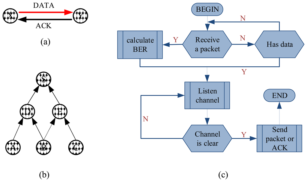For the corrosion-monitoring sensor mote platform, another challenge is how to collect the corrosion data from all the motes with as little human intervention as possible. Using the TinyOS operating system for MicaZ and the Xserve communication framework, we propose a many-to-one routing protocol, to transport data from all sensor motes to a central mote (also called sink). The sink, storing all the corrosion data, can display it visually, and domain scientists can then well understand and predict the progress of the corrosion process. In the proposed routing algorithm, the sensor motes are organized into a multi-hop network which can work in the following two ways: (1) the sink broadcasts a query message, and the motes receiving this message send data back to the sink, and (2) all the motes report their data to the sink regularly, e.g., once per day. In our experiments, we use the latter one. To guarantee the reliability of the data transmission, two schemes are adopted in our work. First, as shown in Figure 3a, we employ the Acknowledgement (ACK) scheme of the IEEE 802.15.4 protocol [29] to improve the link quality with multiple transmissions. Second, a mote always chooses the mote with maximal link quality as its forwarder (the link quality is generally measured by the reception ratio of packets over the link). For example, the mote B in Figure 3b has two possible forwarders, D and E, but it will select D as the next hop if the link to D has higher quality. Based on the CC2420 radio chip used by MicaZ, the link quality can be calculated at the hardware level as the bit error rate (BER) value and consequently, needs no extra codes. Even though the link quality is obtained at the receiver, it can be piggy-backed by the ACK messages from the receiver to the transmitter. By doing so, the transmitter has information about the qualities of links to all the potential forwarders. Figure 3c presents the detailed control logics of our routing algorithm. Note that these control programs can be updated over the air, even if they have been deployed in motes. Such a reprogramming method without recycling motes facilitates the deployment of the new monitoring tasks. The experiments results show that only two packets are lost due to link failure within two hours in our routing scheme.