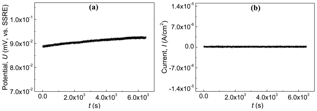 The electrochemical emission signals collected by the wireless corrosion monitoring sensor SN0 of the passive state reinforced concrete panel, including the potential and the current data, are presented in Figure 6a,b, respectively. According to Figure 6a, the potential emission is within a narrow band whose amplitude is no more than 3 mV (vs. SSRE). Besides, the current emission also shows a narrow-band-like distribution, and the amplitude is no more than 2 × 10−7 A/cm2. Which is close to the resolution of the wireless mote itself. The signal could be caused by the white noise of the acquisition system implanted in MicaZ mote or the passive steel/concrete system itself. These results indicate that the amplitude of potential or current emission of the reinforcing steel at passive state is very low, and the high pH value of the hydrated products of cement provides a safe environment to keep the r steel bar immune to chloride ions. Also, the wireless mote SN0 obtains the effective data correctly.