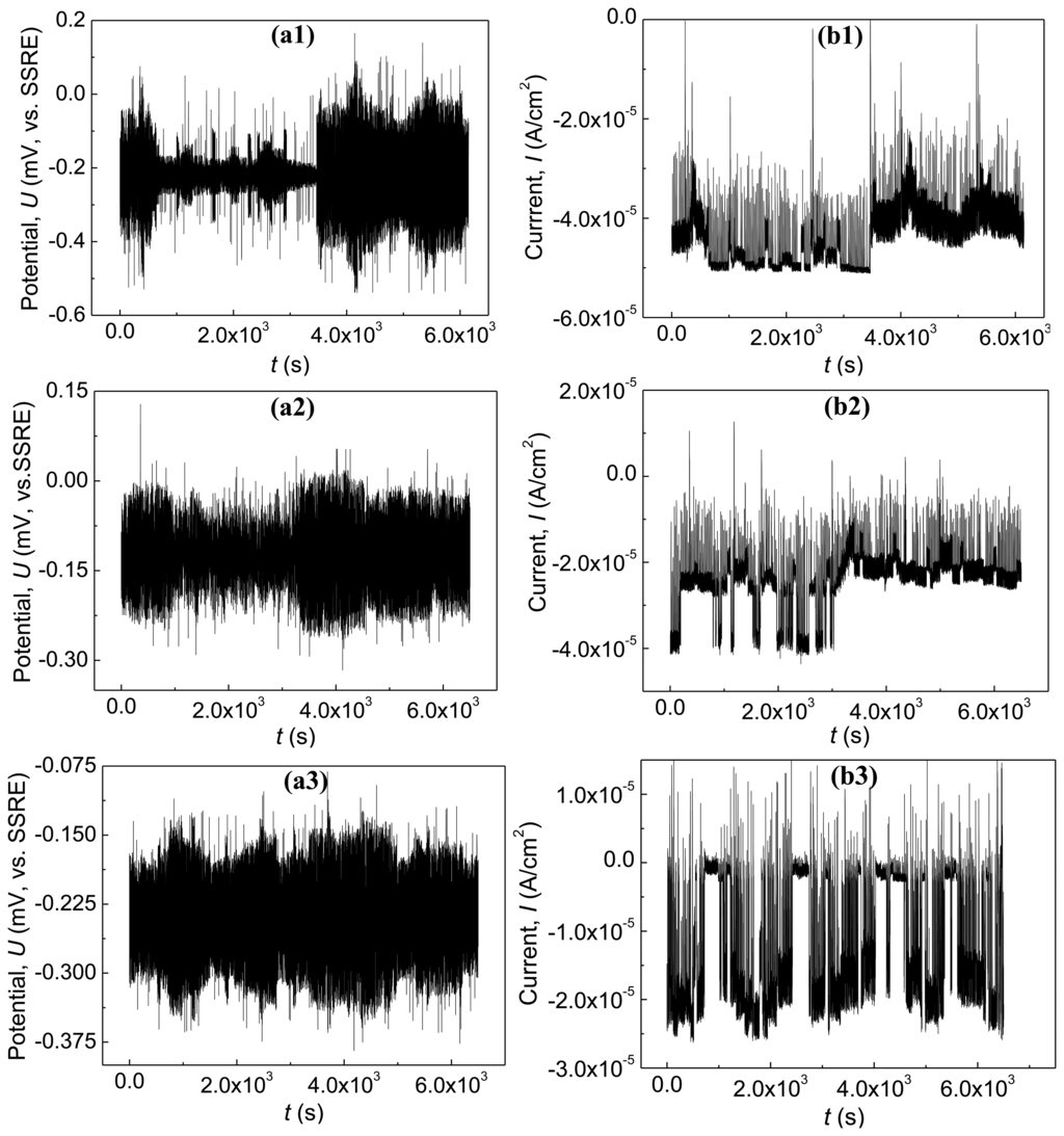 Figure 7 exhibits the potential and the current emissions of the wireless motes SN1, SN2 and SN3 located along the diagonal line of the RC panel in Figure 5 with 3.5% NaCl solution. Lots of potential and current transients appear in the data. The amplitude of the potential emission transients and current emission transients achieve even hundreds of millivolts (vs. SSRE) and several of 10−4 A/cm2, respectively.