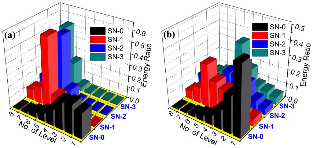 To idey the pitting corrosion qualitatively, the energy distribution algorithm of the electrochemical emission signal in wavelet domain described in Section 3 of this paper is applied to analyze the potential and current emission data in Figures 6 and 7. The orthogonal Sym4 wavelet is utilized to decompose the electrochemical emission data in depth of 8-level, and the approximation signal in 8-level is removed as the harmful trend. Then, the decomposed signal in each level is reconstructed and the energy distribution plots are obtained based on the Equation (3). Figure 8a,b illustrates the energy ratio on each level of the potential and current emission data, respectively. According to Figure 8a, the energy of potential emission data collected by SN0 at passive sate accumulates on the level 1–3. The frequency of these parts between 1 and 2–3 Hz is much higher than that of other parts. However, the energy transfers to level 5–8 as the pitting corrosion appears. The energy condensed on these levels is no less than 80% of the total energy. The frequency of the levels from 5 to 8 is no more than 2–5 Hz. The condition of electrochemical current emission in Figure 8b is similar with that of the electrochemical potential emission in Figure 8a. According to the change of the energy distribution on the different crystal, the pitting corrosion is verified. The energy which is distributed on the level 5–8 is the intrinsic characteristics of pitting corrosion of the reinforcing steel in concrete. The energy distribution plot of the electrochemical emission signal can be applied as the benchmark to qualitatively idey the presence of the pitting corrosion. Actually, the in-situ, real-time and on-line corrosion monitoring information of the electrochemical emission spectrum could be applied to drive the 3-D cellular automata to quantitatively predict the development of the corrosion pit. Considering the aim of this paper, we do not discuss this point in detail here.