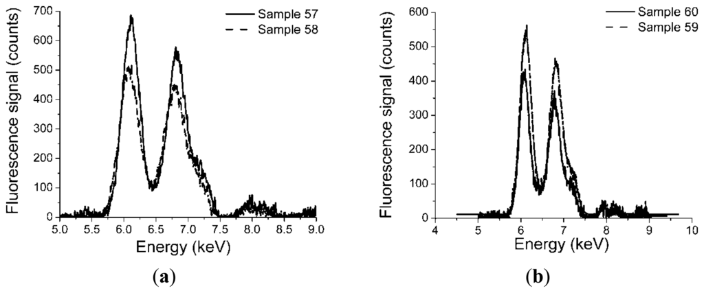 As six sensors were produced using similar glue-phosphor mixture preparation methods, we were interested in examining the reproducibility of this process. For this purpose, X-ray fluorescence tests were done in a frontal irradiation geometry, for sensors pairs 57/58, and 59/60 to check the elemental composition, by exposing the sensor tip end to a 2 mm diameter X-ray beam in its central region, with an angle of incidence of 22.5 degrees and the angle of detection of 22.5 degrees. The X-ray source driving voltage was V = 40 kV, at a driving current of I = 90 μA. These values were kept constant during the tests. Figure 1 shows the fluorescence response of the characterized sensors. It can be noticed that the elemental composition does not differ more than 10%. The difference is not significant considering the manual manufacturing process involved. This is a factor which has to be accounted when comparing the responsivity of different sensors.